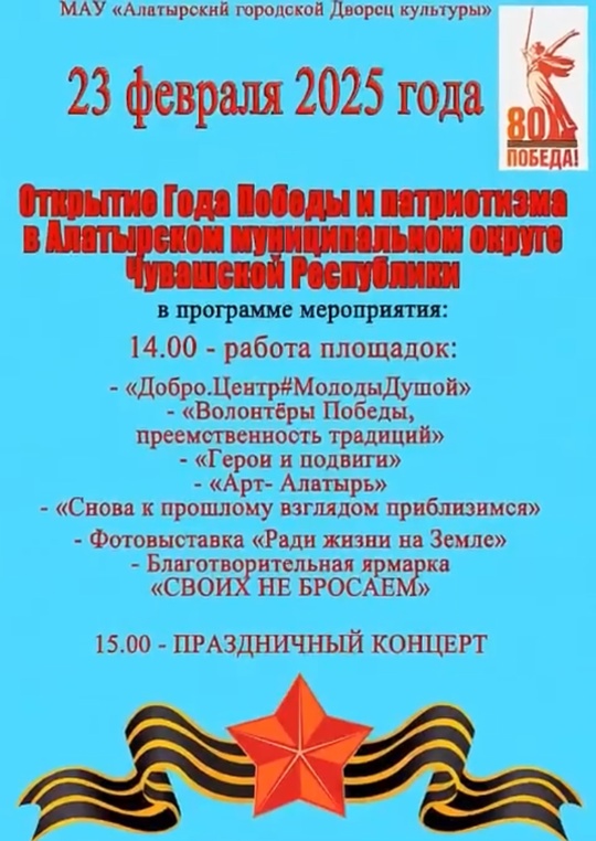 23 февраля в культурном Дворце Алатыря пройдет церемония открытия Года Победы и патриотизма в округе Чувашской Республики.
